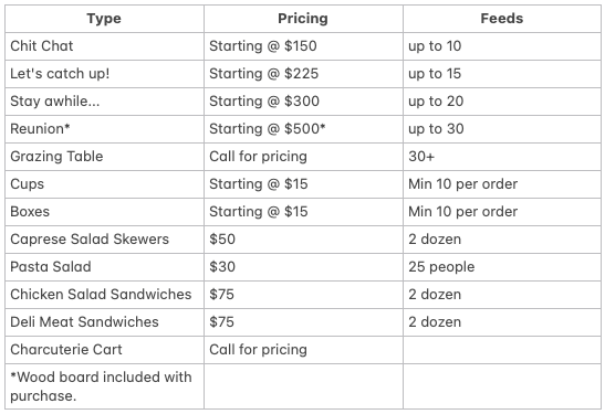 When the mind wanders, creativity takes over, and sample boards emerge as the result. Below are examples of items and portions created for your group to enjoy.
